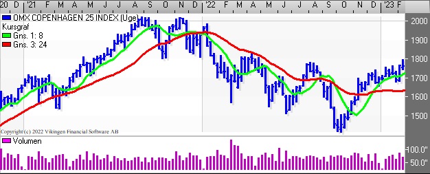 Der er en stigende tendens i de tre indikationsmodeller på ugebasis. RSI har ramt 65 og MACD er fortsat over middelværdien 0. Momentum er ved at etablere en bundformation. Nærmeste modstandsniveau 1800 og herefter i niveauet 1900, mens der er støtte i niveauet 1700 og herefter i niveauet 1650.