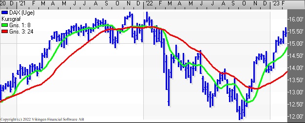 På ugebasis er der købssignal i Bollingerkanalen og det har stået på siden begyndelsen af november. De glidende gennemsnit på 8 og 24 uger har etableret et Golden Cross for 2 uger siden.