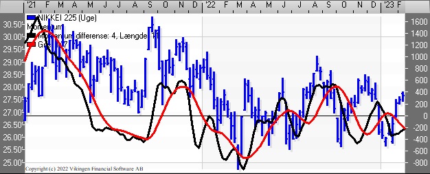 Det japanske marked fortsætter med at bevæge sig vandret i niveauet 27.000-28.000. Der er købssignal på dagsniveauet i alle modeller. På ugebasis holder købssignaler i Bollingerkanalen og de glidende gennemsnit på 8 og 24 uger er blevet brudt nedefra, men der er endnu ikke etableret et Golden Cross endnu.