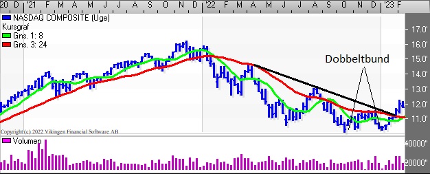 Nasdaq Composite der har været købssignal i Bollingerkanalen og de glidende gennemsnit på 8 og 24 dage siden begyndelsen af januar.