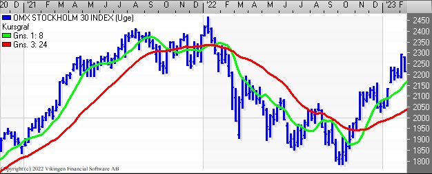 OMX Stockholm 30 kunne ikke bryde igennem 2300 og er faldet tilbage i niveauet 2250-2300. Der er fortsat købssignal i alle modellerne på ugebasis. Der er divergens mellem de tre indikationsmodeller på ugebasis, da RSI er i en faldende tendens og har ramt 65. Momentum er ligeledes i en faldende tendens, mens MACD er i en stigende og over 0.