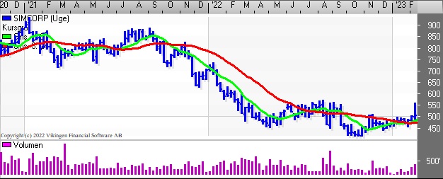 SimCorp leverede torsdag deres regnskab en uge før tiden. Markedet kvitterede med en stigning på over 4,9 pct. Teknisk er er aktiekursen i en stigende tendens og det har sendt RSI op i 80. MACD er over middelværdien 0. Momentum stiger ligeledes igen og har ramt modstandsniveauet 550 som blev testet tilbage i august 2022. Aktien ser interessant ud på niveauet.