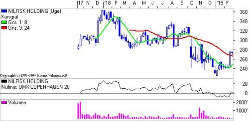 Er det bare almindelig markeds-eufori eller ligger der noget reelt bag Nilfisk-stigningen? Efter spaltningen af Nilfisk har aktiekursen kun haft en vej og det var nedaf. I 2018 startede aktien i 360 og sluttede året i 230. I begyndelsen af 2019 ramte Nilfisk-aktien 224 og i dag handles aktien til 275,2 – en stigning på 22,8 pct.