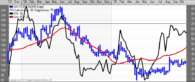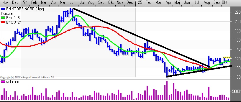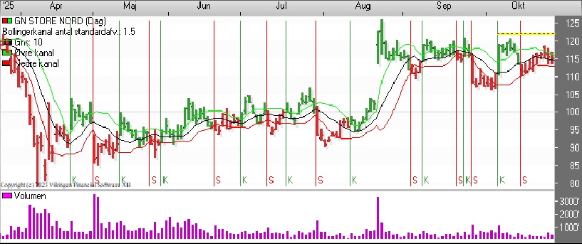Hvem vinder i GN Store Nord – shorterne eller de langsigtede investorer? Der er en sivende tendens i aktien efter toppen i august, hvor kursen lå omkring 125. Der er dog fortsat en stigende tendens i bundene på dagsniveauet.