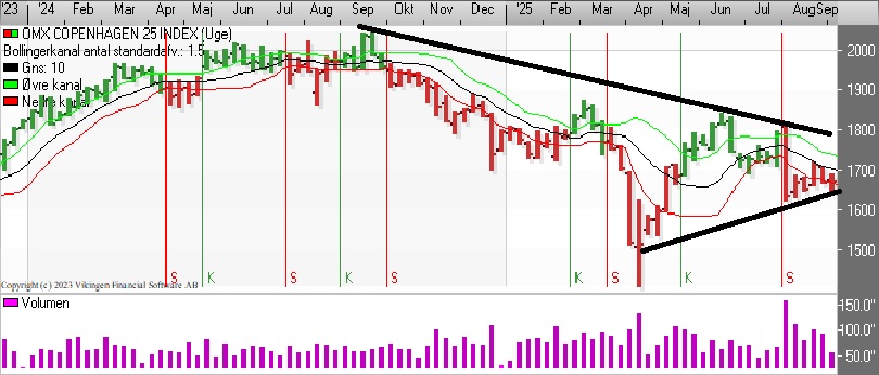 C25-indekset har på dagsniveau etableret et salgssignal i både kursgrafen og Bollingerkanalen. På ugebasis er der også salgssignaler i både kursgrafen og Bollingerkanalen.