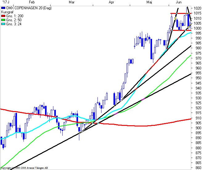 Ser BørsUdsigten på dagschartet for C20 (1.005), ligger vi fortsat i en sidelæns konsolidering med en bundlinie i 997 niveauet og en toplinie i 1.015 niveauet. BørsUdsigten anlægger en udbrudsstrategi, såfremt man ikke vil ”handle sig fattig” for at ligge rigtigt i markedet. Brud af 1.015 niveauet vil betyde en målzone p 1.040 niveauet.