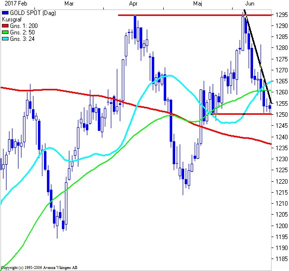 Ser BørsUdsigten på dagschartet for guld (1.253) ligger vi i en konsolidering i en kopformation. Brud af 1.255 vil udløse spekulativt købesignal, og brud af 1.295 et sekundært ditto.