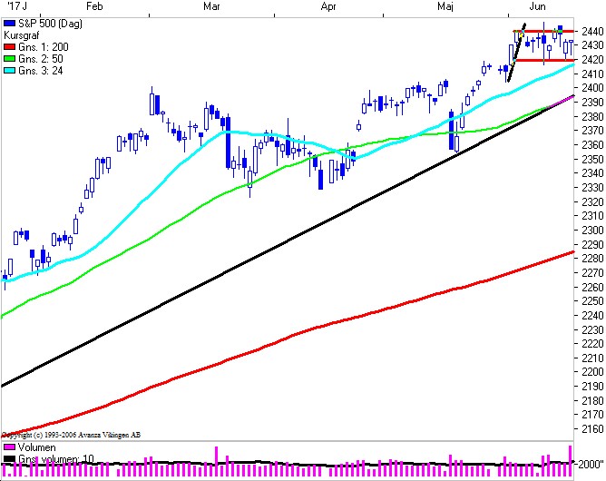 Ser BørsUdsigten på dagschartet for S&P500 (2.433), er situationen uforandret. Der er fortsat tale om en sidelæns konsolidering. Efter en test onsdag af toplinien i 2.440 niveauet skulle vi torsdag teste bundlinien i 2.420 niveauet. Begge angreb blev afvist, og det giver gode muligheder for en ny test af toplinien. Når aktierne ikke kan komme ned – så skal de op (;-D).