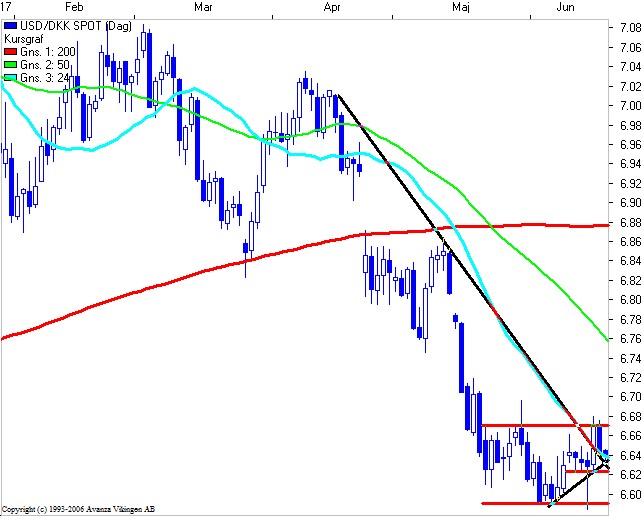 Ser BørsUdsigten på dagschartet for valutakrydset USD/DKK (6,64), ser vi et lille tilbageslag, der kan give luft til et nyt angreb på toplinien.
