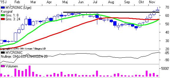 Mycronic er brudt over den foregående top fra juni, hvor kursen var i niveauet 62-64. Siden faldt aktien tilbage og etablerede en dobbelt bund i niveauet 44, 5-46 med bund i slutningen af august og begyndelsen af oktober. Siden har aktien været i en stigende tendens og de glidende gennemsnit er tæt på at etablere et ”Golden Cross”. Signalmodellerne er i køb på ugebasis og har været det i 4 uger. Den positive tendens i aktiekursen trækker op i de tre indikationsmodeller på ugebasis.