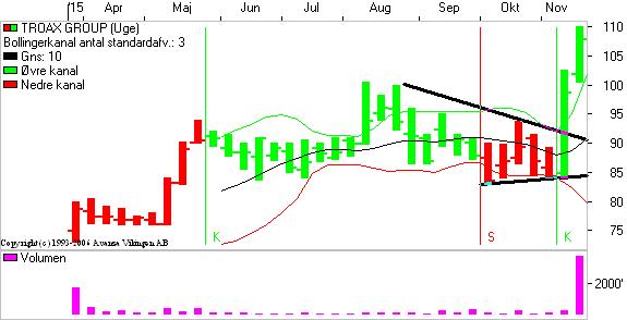 Troax Group er steget kraftigt i de sidste 3 dage fra niveauet 88,50 til 105-110. Stigningen har givet et nyt købssignal i Bollingerkanalen på dags- og ugeniveauet. De glidende gennemsnit har etableret et ”Golden Cross” på dagsniveauet og i løbet af 1-2 uger vil der blive etableret et ”Golden Cross” på ugebasis. Stigningen i aktiekursen trækker op i Momentum på ugebasis.