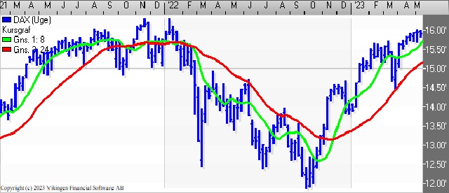 På ugebasis holder købssignalet fortsat i begge modeller. I Bollingerkanalen blev det etableret ved månedsskiftet marts/april. Det glidende gennemsnit etablerede tilbage i januar et Golden Cross.