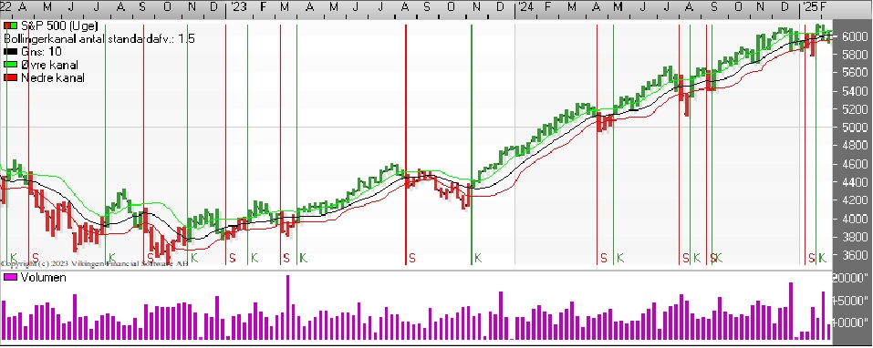 S&P 500 har købsignal i kursgrafen på dagsniveauet, mens Bollingerkanalen er i salg – en situation, der har varet i to dage. På ugebasis er der købsignal i både kursgrafen og Bollingerkanalen.