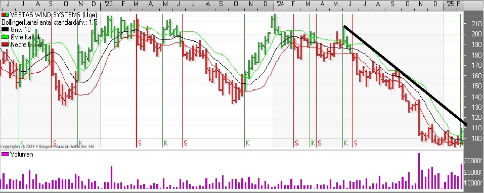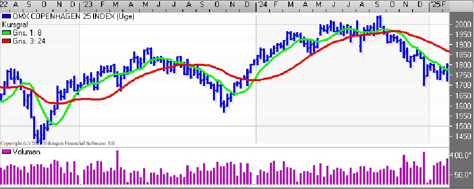 C25-indekset har på dagsniveau etableret købssignal i Bollingerkanalen torsdag. De glidende gennemsnit på 8 og 24 dage ligger side om side. På ugebasis er der salgssignal i både Bollingerkanalen og kursgrafen. Hvis kursen bryder igennem 1810, vil Bollingerkanalen etablere et købssignal.
