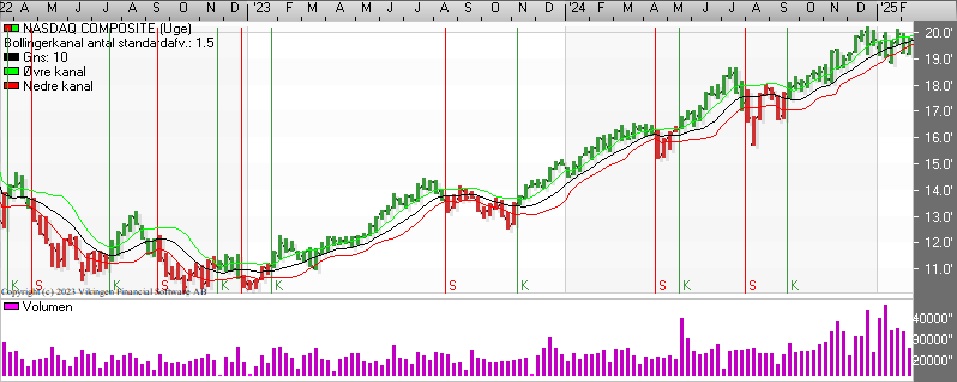 Nasdaq Composite er i salg i Bollingerkanalen på dagsniveau, mens kursgrafen også er i salg. På ugebasis er der dog købssignal i både Bollingerkanalen og kursgrafen.