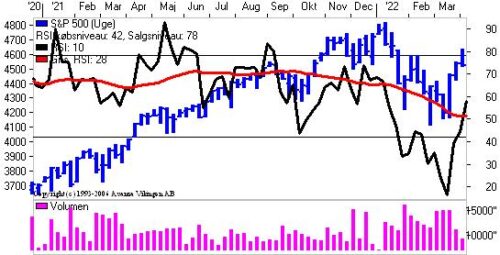 Nærmest modstandsniveau ved 4600 er blevet testede i den uge og næste modstandsniveau er ved 4700. Der er støtte i niveauet 4300 og herefter i niveauet 4200.