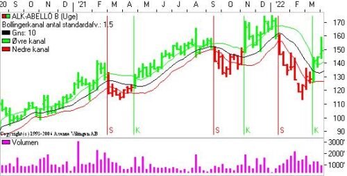 ALK-Abelló har på dagsniveauet etableret et købssignal i slutningen af februar i Bollingerkanalen og de glidende gennemsnit på 8 og 24 dage har etableret et ”Golden Cross” i begyndelsen af marts.