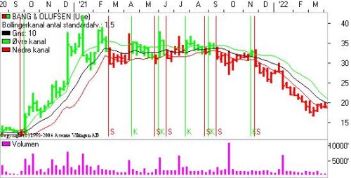 Bang & Olufsen har været i en faldende tendens siden september, hvor aktien blev handlet i niveauet 30-35. I begyndelsen af marts ramte aktiekursen 16,6 og siden har aktiekursen været i en stigende tendens og fredag blev aktien handlet i 19,07 – 19,52. Det betyder, at der er etableret nye købssignaler på dagsniveauet.