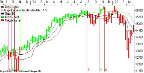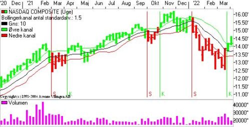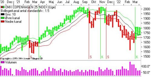 På ugebasis er der ligeledes etableret et nyt købssignal i Bollingerkanalen. Det korte glidende gennemsnit er blevet brudt nedefra, mens det lange glidende gennemsnit ligger i niveauet 28 som en modstandslinie. Bollingerkanalen har etableret et købssignal i denne uge og kursen skal holde sig over 28 for at signalet består.