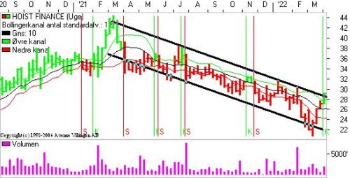 Hoist Finance har etableret et købssignal på dagsniveauet i midten af marts ved at de glidende gennemsnit på 5 og 20 dage har etableret et ”Golden Cross” og Bollingerkanalen brød igennem den øvre kanallinie.