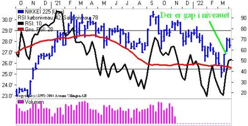 Det japanske marked bevæger sig vandret i niveauet omkring 28.000. Det betyder, at de købssignaler som blev etableret for 9 dage siden fortsat er intakt på dagsniveauet. På ugebasis holder købssignalerne også. Bollingerkanalen og Parabolic holder fast i deres købssignal fra forrige uge. De glidende gennemsnit er brudt igennem nedefra af den stigende tendens i aktiekursen.