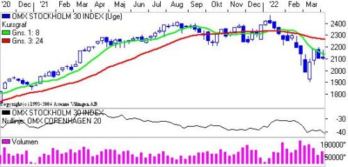 OMX Stockholm 30 bevæger sig vandret i niveauet 2100-2200. Den vandrette formation har fået Bollingerkanalen til at gå i salg, mens de glidende gennemsnit på dagsniveauet holder. Det lange glidende gennemsnit ligger i niveauet 2100 som en støttelinie.