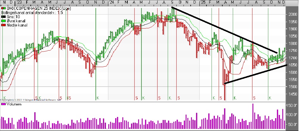 C25-indekset har fået etableret købssignal i både kursgrafen og Bollingerkanalen på dagsniveau. På ugebasis er kursgrafen ligeledes gået i køb i denne uge. Bollingerkanalen holder fast i købssignalet, der blev etableret ved månedsskiftet september/oktober.