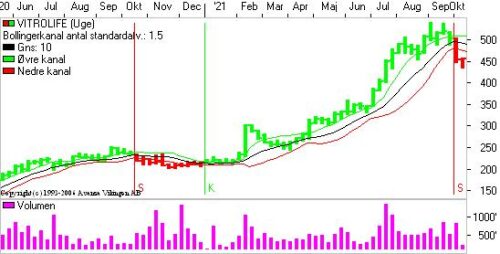 På ugebasis er Bollingerkanalen i salg og har været det i 2 uger. Man skal tilbage til oktober- december for at finde modellen i salg. Det lange glidende gennemsnit ligger i niveauet 420 som en støttelinie.