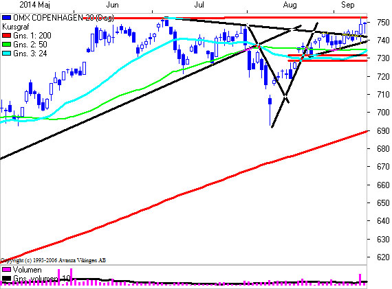 BørsUdsigten noterer dog, at momentum (accelerationen) er faldende på den lange bane, hvilket gør det sværere at tjene penge. Brud af 751 niveauet bekræfter BørsUdsigten’s ”All In” strategi. Indtil nu har det været en meget svag acceleration. Spørgsmålet er fortsat, om vi skal have et tilbageslag ned mod ”gappet” mellem 731,18 niveauet (tidligere 732,63), og bunden i 728,58 niveauet, før et nyt angreb / brud af toplinien i 751 niveauet.