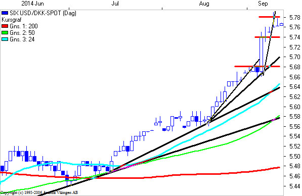 Ser vi på dagschartet for USD/DKK (5,765), ligner det en opbremsning efter en rigtig flot acceleration.