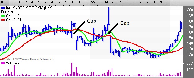 Aktier med tre gaps på det danske marked er Lundbeck B samt NetCompany. Jeg har undladt at se på de danske small cap-aktier. Grunden til at jeg har valgt selskaber med 3 gaps eller flere er, at det ofte er en kapitulationsfase investorerne er inde.