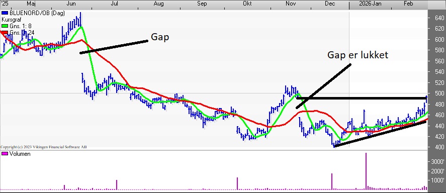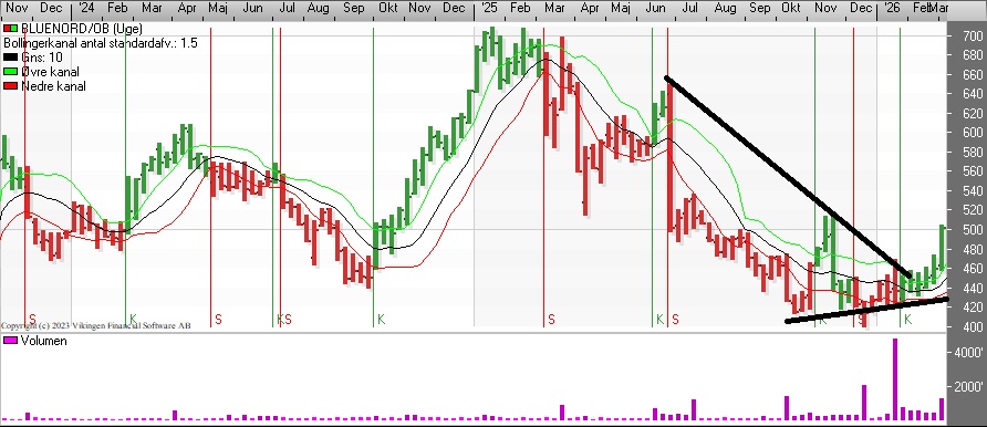 Der er en stigende tendens i de tre indikationsmodeller på ugebasis. RSI er steget fra 40,5 til 67,6. Momentum er i en stigende tendens, og det samme gælder MACD. MACD er over middelværdien 0 på ugebasis. Målkurs: 700 og Stop-loss: 450. Fastholder køb på niveauet.