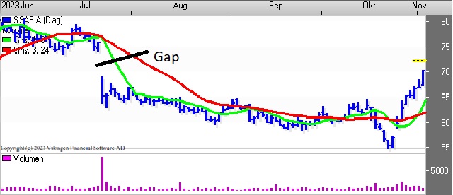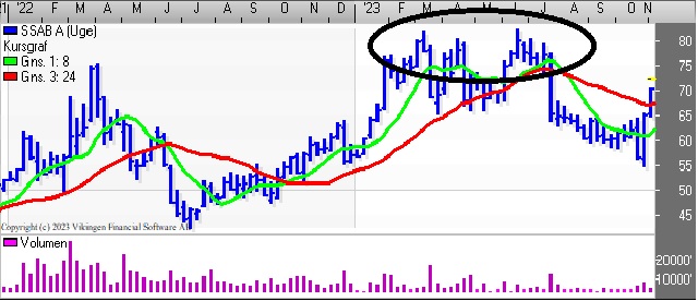SSAB-aktien testede modstandsniveauet 80 tre gange, men uden at bryde igennem. Første gang var i marts, anden gang var i april og tredje gang var i juni. Siden faldt aktien tilbage til støtteniveauet 55 og nu er aktien handlet op i niveauet 65-70.