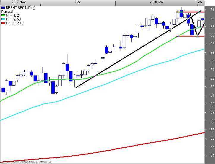 Ser BørsUdsigten på dagschartet for UK Brentkvaliteten (69,9), er der sket en opbremsning i den sekundære / tertiære trend ved bruddet af 69 niveauet. Det har udløst både et tertiært; men også et sekundært salgssignal. I første omgang er der tale om en opbremsning (konsolidering). Konsolideringen ligner en positiv fortsættelsesformation. Spekulativt/tertiært købesignal ved brud af den faldende trend i 69 niveauet, og første støtte i 68 niveauet. Den lange trend er fortsat op.
