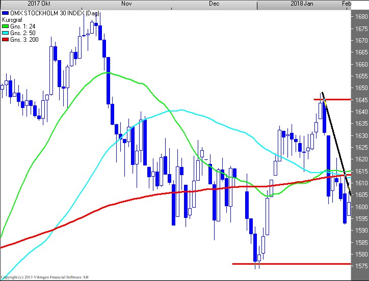 Ser BørsUdsigten på S30 indekset 1.602 (plus 0,6 pct. (8,69 point), er der fortsa tale om en tertiær nedtrend. Chartet balancerer vi på kanten af et fuldstændigt ”Death Cross”, og dermed EXIT af svenske aktier. Både det 24 dages og det 50 dages glidende gennemsnit er ved at bryde det 200 dages glidende gennemsnit ovenfra – hvilket er et rent salgssignal.