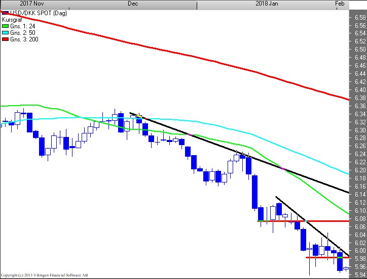 Ser BørsUdsigten på dagschartet for valutakrydset USD/DKK (5,958), blev den negative trend genoptaget, efter bruddet af 5,98 niveauet. Dermed er salgssignalerne blevet bekræftet på ny, hvilket BørsUdsigten havde forventet: BørsUdsigten noterer at presset fortsat er fra oven (faldende højeste).