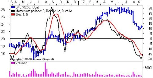G4S-aktien er faldet som en sten gennem august måned og har ramt kursniveauet 23. Faldet har givet salgssignal i både Bollingerkanalen og Parabolic. De glidende gennemsnit er blevet brudt oppefra og der er etableret et ”Death Cross”. Aktien har de sidste 11 dage bevæget sig vandret i niveauet 22,5-23,5.