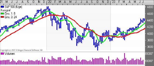 På ugebasis er der fortsat købssignal i både Bollingerkanalen og de glidende gennemsnit på 8 og 24 uger.