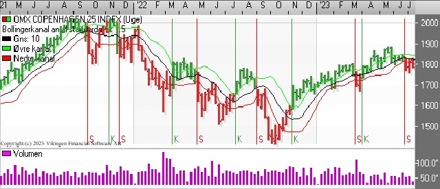 C25-indekset har en sivende tendens på både dags- og ugeniveaet. Der er divergens mellem kursgrafen og Bollingerkanalen, da Bollingerkanalen har købssignal, mens de glidende gennemsnit er blevet brudt af den faldende tendens i kursen.
