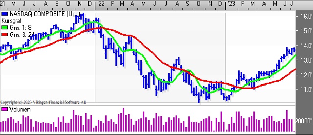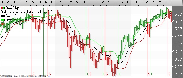 På ugebasis er der købssignal i Bollingerkanalen. Det korte glidende gennemsnit er blevet brudt nedefra, mens det lange glidende gennemsnit ligger i niveauet 13.800 som en modstandslinie.