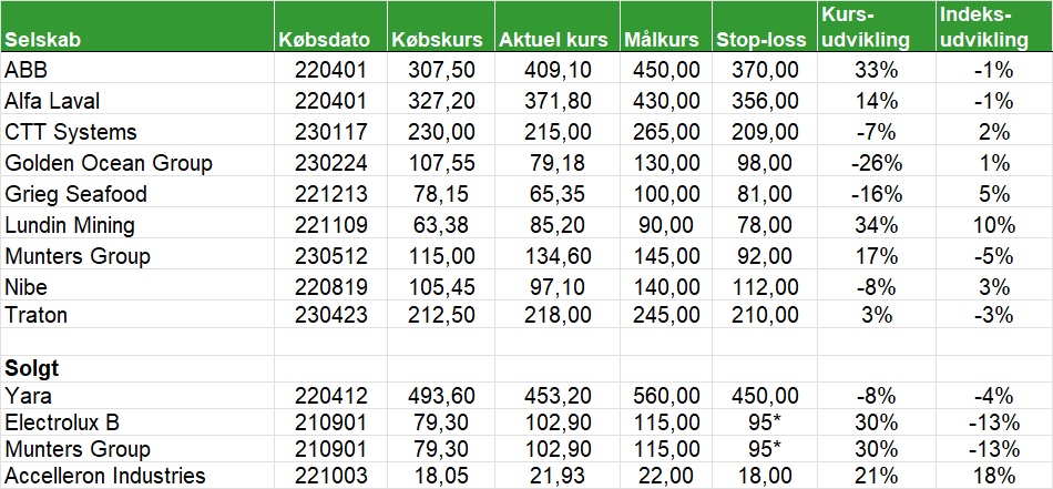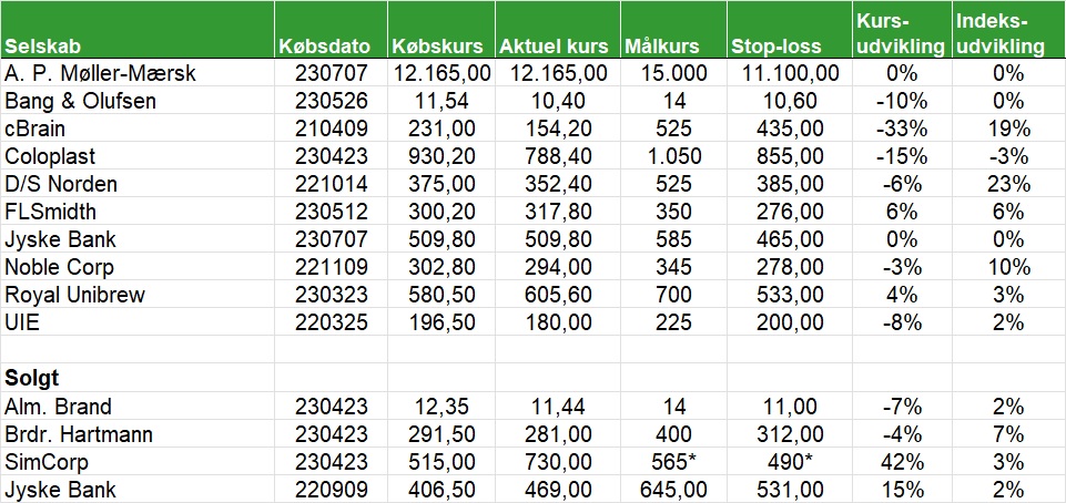 Den danske portefølje har år til dato givet et afkast på 2,5 pct. mod C25-indekset som har givet et afkast på 4,25 pct. Tager A. P. Møller-Mærsk og Jyske Bank med i porteføljen. På salgslisten er B&O, cBrain, Coloplast, D/S Norden og UIE.