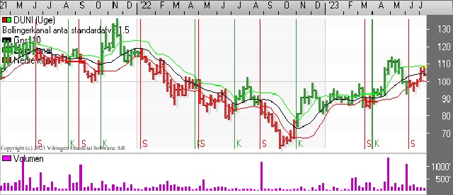 Duni tester modstandsniveauet 110-115 som blev testet i maj men ikke brudt. På dagsniveauet er der etableret købssignal i Bollingerkanalen i midten af juni. De glidende gennemsnit på 8 og 24 dage har etableret et Golden Cross for 6 dage siden.