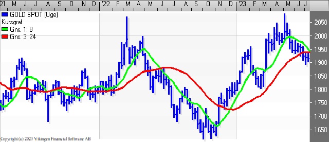 På ugebasis er Bollingerkanalen i køb og det har modellen været i 4 uger. Det korte glidende gennemsnit på 8 uger er tæt på at bryde igennem det lange glidende gennemsnit på 24 uger nedefra og vil derfor etablere et Golden Cross.