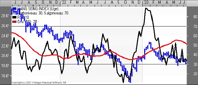 Med torsdagens fald i Hang Seng Index er der etableret et salgssignal på dagsniveauet i både Bollingerkanalen og de glidende gennemsnit på 8 og 24 dage, der begge blevet brudt oppefra. På ugebasis der er salgssignal i både Bollingerkanalen og de glidende gennemsnit på 8 og 24. Der er en faldende tendens i de tre indikationsmodeller på ugebasis. RSI har ramt 35 og MACD er under middelværdien 0 på ugebasis.