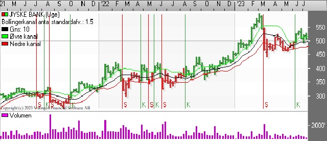 Jyske Bank faldt tilbage i marts, da flere amerikanske banker fik det svært. Aktien fandt støtte i niveauet 460-470 i løbet af foråret og forsommeren. Nu handles aktien i niveauet 510-530. På dagsniveauet har de glidende gennemsnit etableret et Death Cross. Bollingerkanalen er i salg og har været det i 9 dage.