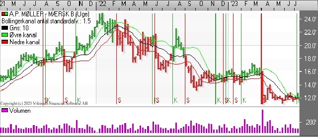 A. P. Møller-Mærsk-aktien har bevæget sig vandret i niveauet 11,500-13.000 siden udbetalingen af udbytte i slutningen af marts. De glidende gennemsnit på dagsniveauet har netop etableret et Golden Cross. Bollingerkanalen er gået i køb igen, hvilket er 4. gang efter marts.