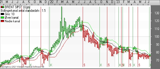 Bollingerkanalen har etableret et nyt købssignal, mens det lange glidende gennemsnit ligger i niveauet 80 som en modstandslinie. Der er divergens mellem de tre indikationsmodeller på ugebasis. RSI stiger, mens Momentum er i en faldende tendens. Nærmeste støtteniveau er ved 72 og herefter i niveauet 70, mens der er modstand i niveauet 78 og herefter i niveauet 80