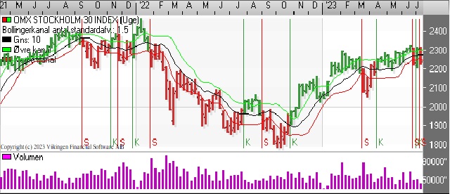 OMX Stockholm 30 bevæger sig fortsat vandret i niveauet 2.200-2.300. På dagsniveauet er der divergens mellem Bollingerkanalen og de glidende gennemsnit. Bollingerkanalen er i køb på dagsniveauet, mens de glidende gennemsnit har etableret et Death Cross.