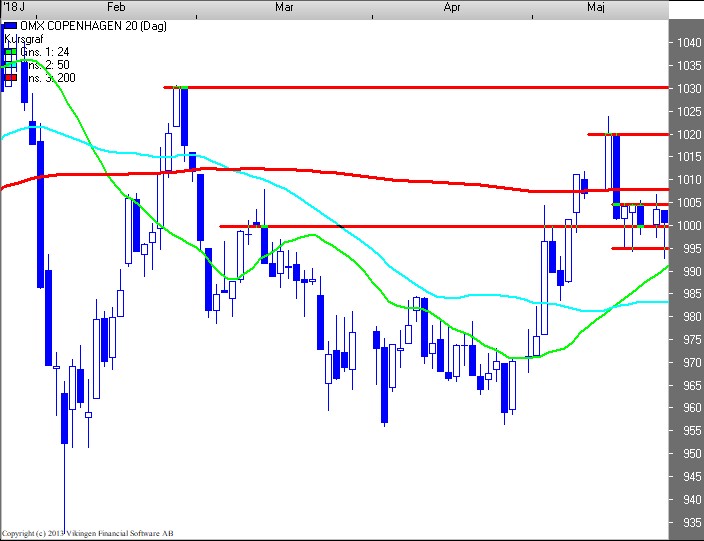 Tertiært / spekulativt (kort sigt) har BørsUdsigten hjemtaget gevinst ved brud af 1.010 niveauet. Genkøb ved brud af 1.005 niveauet. Åbning af spekulativ short ved brud af 1.000 niveauet (testes NU). Strategi: Sælg