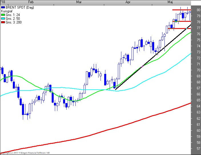 Ser BørsUdsigten på dagschartet for UK Brentkvaliteten (79,5), ligger vi i den forventede konsolidering i 80 niveauet. Toplinien ligger i 80 niveauet og bundlinien ligger i 78 niveauet. Der er tale om en tertiær konsolidering. Brud af 80 niveauet indikerer en test af 100 niveauet.